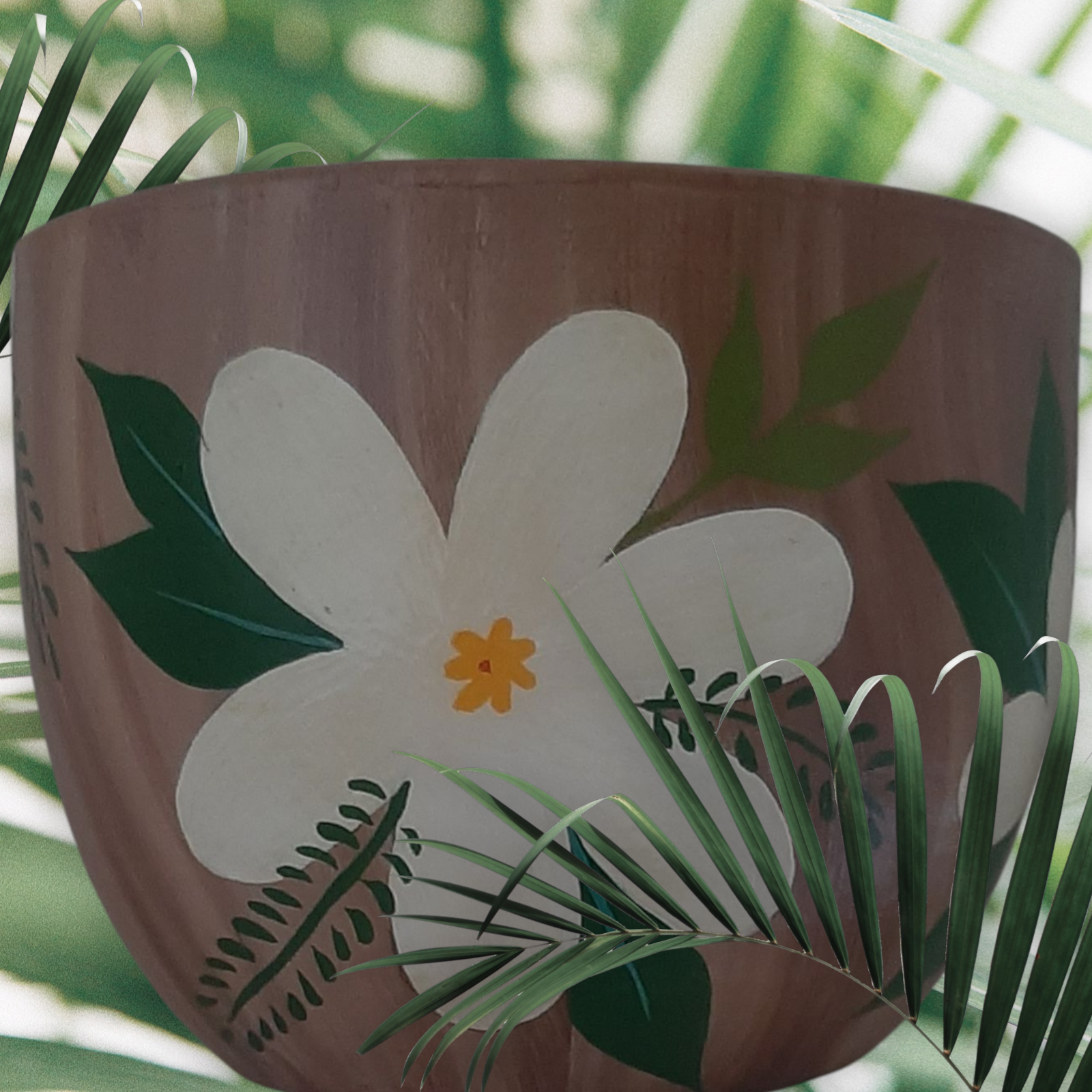Cachepot de cerâmica pintado a mão, com flores brancas, miolo amarelo e vermelho e folhas e raminhos verdes. Fundo marrom claro com nuances.