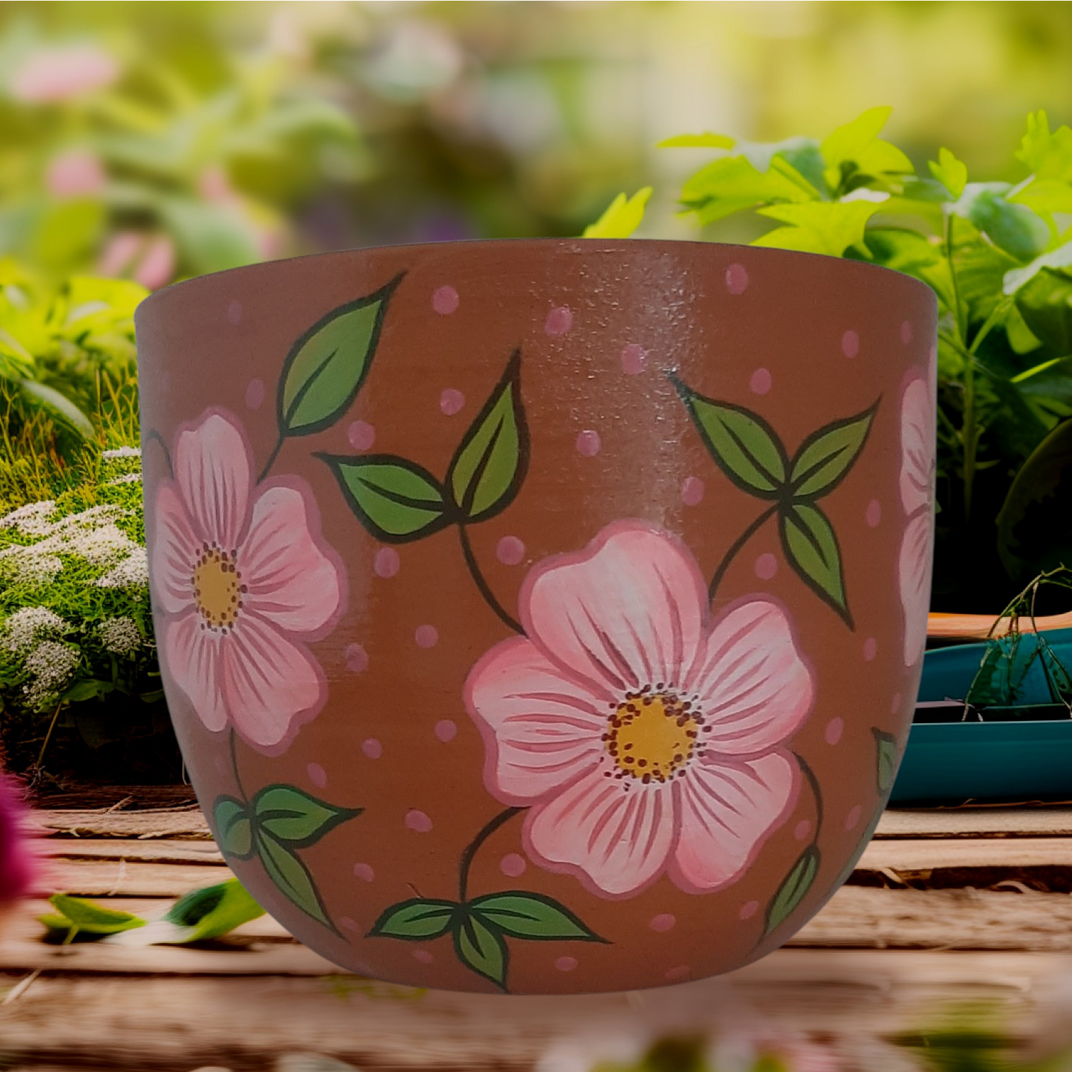 Cachepot de cerâmica vermelha, pintado a mão, com flores rosas e folhas verdes.