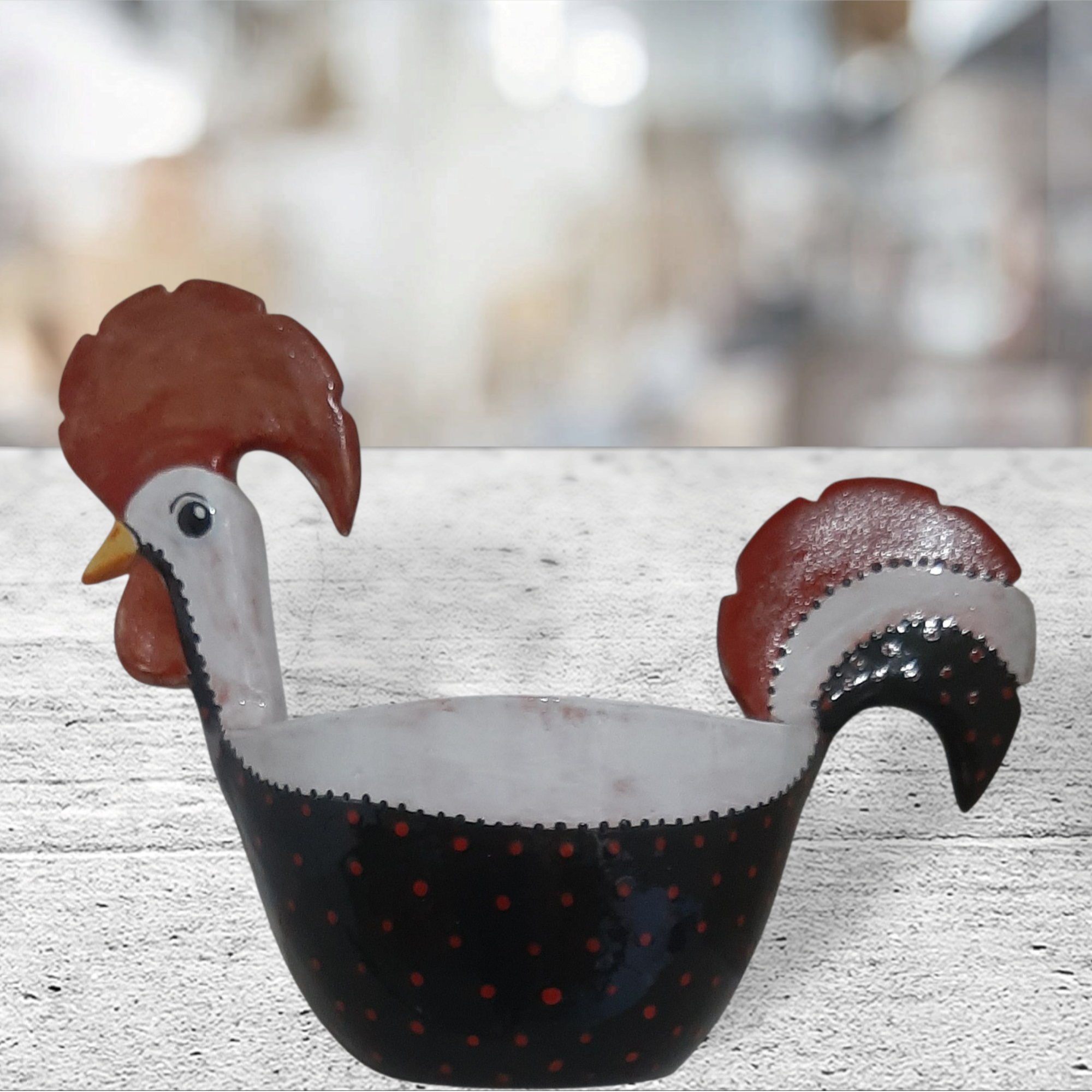 Galo de cerâmica pintado a mão, nas cores vermelho, preto e branco, com bico amarelo.