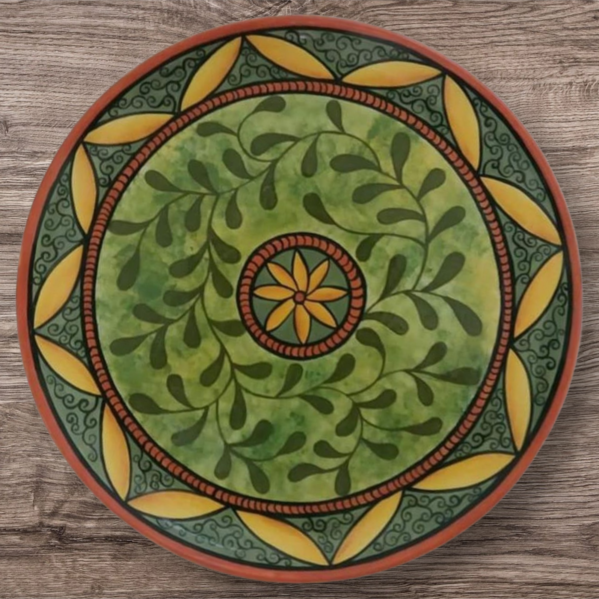 Prato de cerâmica pintado a mão, com 28 cm de diâmetro, com desenho de mandala e folhas.