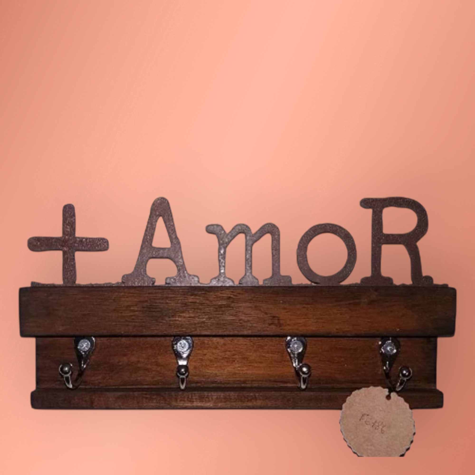 Cabideiro de madeira, com 4 ganchos, com decoração "+ Amor" em ferro, com 23,5 cm de largura x 12,5 cm de altura x 4,5 cm de profundidade.
