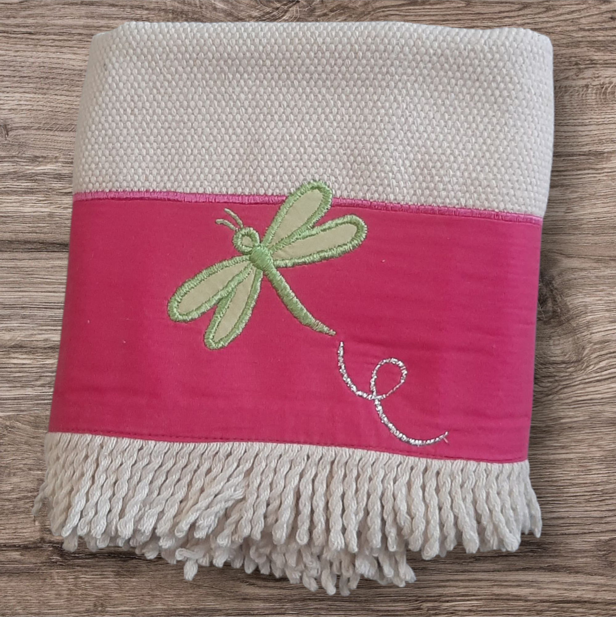 Tapete de tear com aplicaplicação de tecido na cor pink, com libélula bordada, na cor verde claro, com franja.