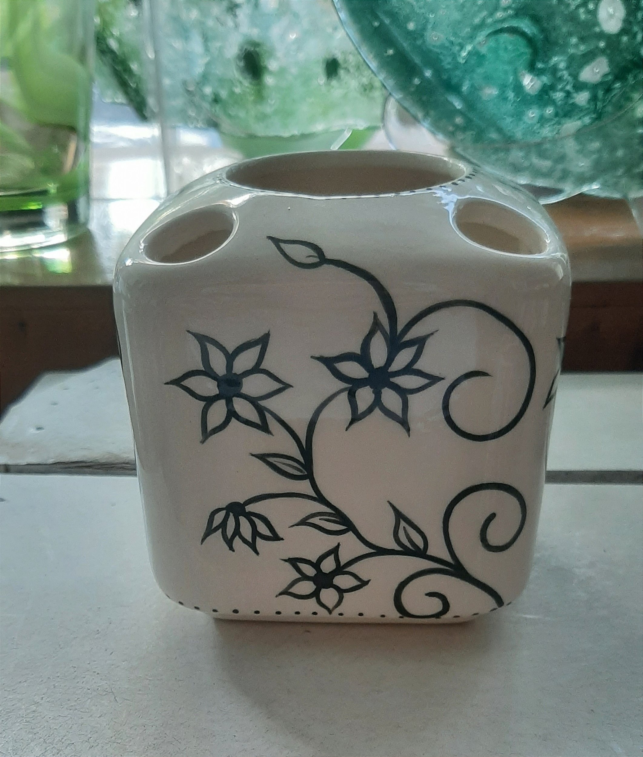 Porta escovas de dentes e creme dental de cerâmica, pintado a mão, com flores e galhos filetados em preto.